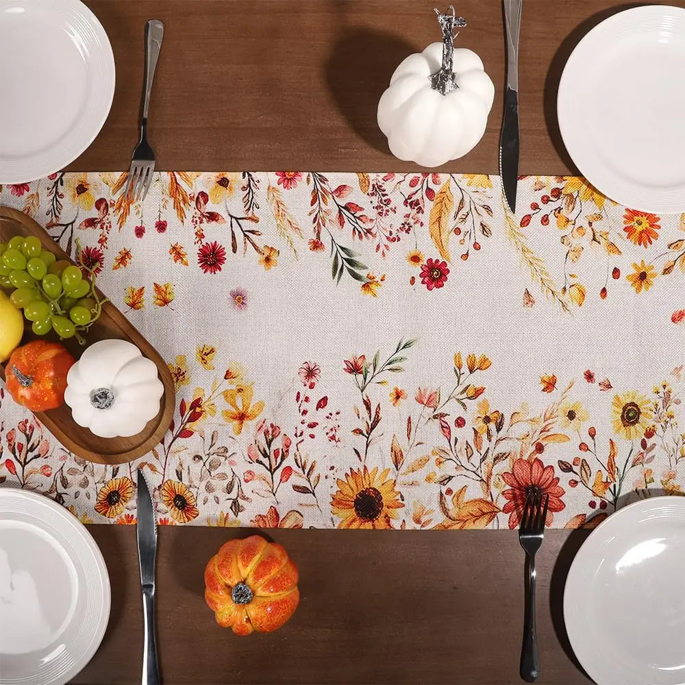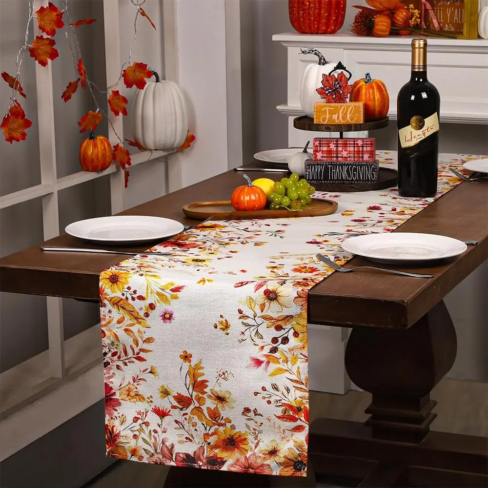 Fall Thanksgiving Plants Leaves Floral Linen Table Runner Tabletop Decor Farmhouse Kitchen Dining Table Runner Party Decor